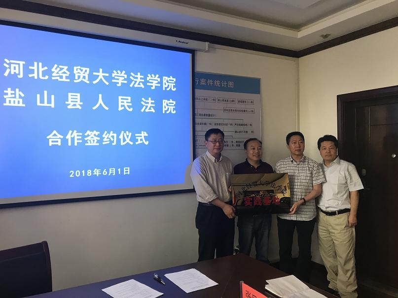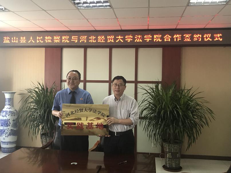 2018年6月1日—2日,Beat365中文官方网站党委书记郭广辉教授、院长王利军教授赴沧州市盐山县,就Beat365中文官方网站在盐山县人民法院、人民检察院以及常庄乡设立实践基地事宜进行洽谈并签署了合作协议。盐山县人民检察院党组书记检察长石培德、盐山县人民法院院长李京等单位负责人与Beat365中文官方网站领导进行了座谈并签署了合作协议。之后举行了实习基地挂牌仪式。