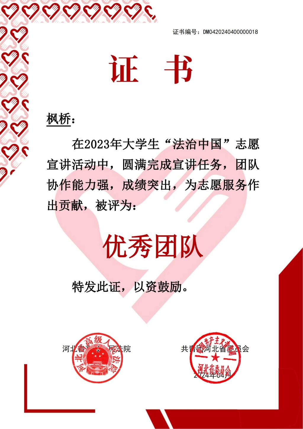 Beat365官网Beat365中文官方网站 “枫桥”普法志愿宣讲团在141所高校所组建的126支实践团队中脱颖而出,圆满完成了宣讲任务,团队协作能力强,成绩突出,为普法志愿服务作出贡献,被河北省高级人民法院和共青团河北省委员会评为“优秀团队”。