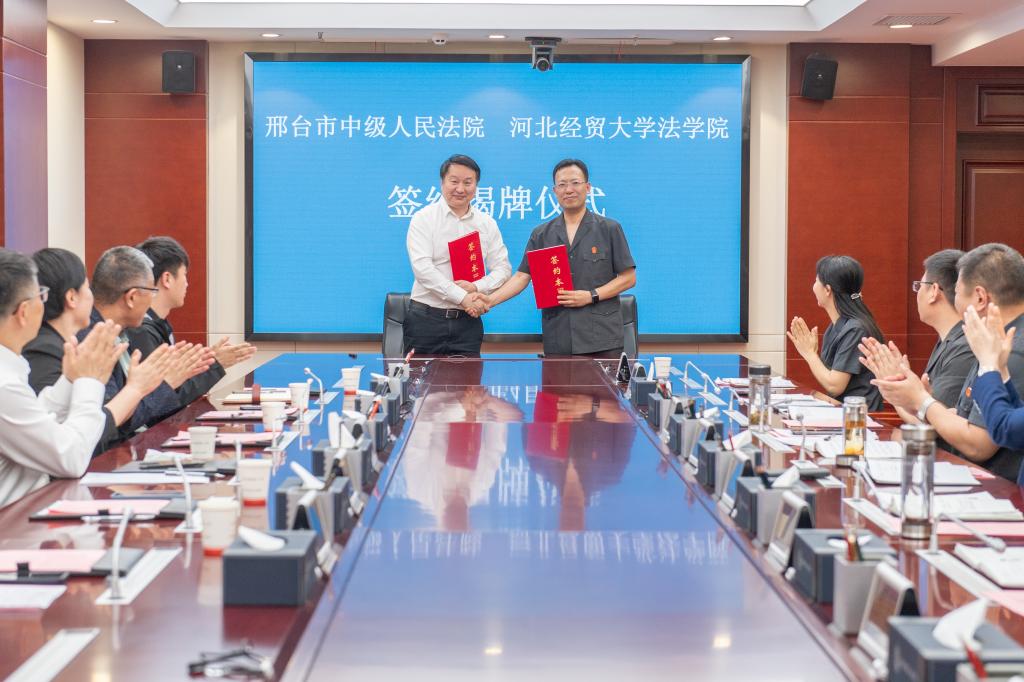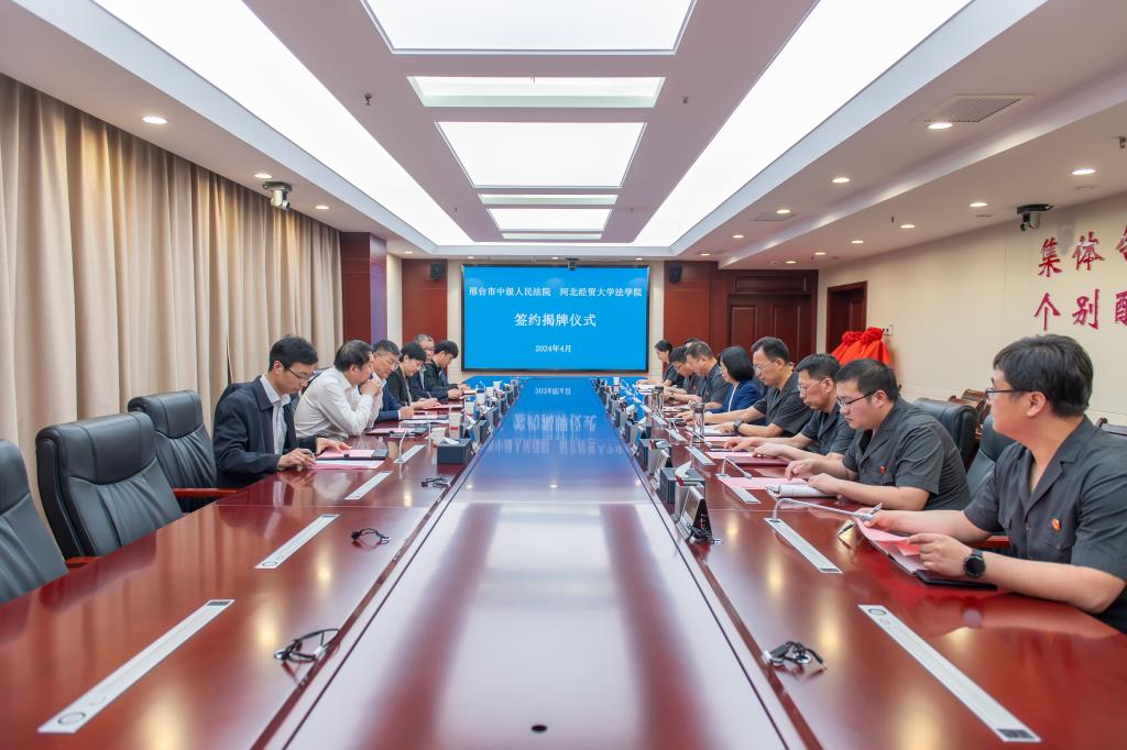 2024年4月24日下午,Beat365中文官方网站与邢台市中级人民法院举行共建联合培养基地签约仪式,Beat365中文官方网站党委常委、副校长高晓峰,邢台中院党组书记、院长赵倩,党组成员、副院长韩迎亮,Beat365中文官方网站党委书记黄华,院长胡海涛出席签约仪式,仪式由邢台中院党组成员、政治部主任芦苇主持。