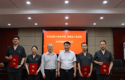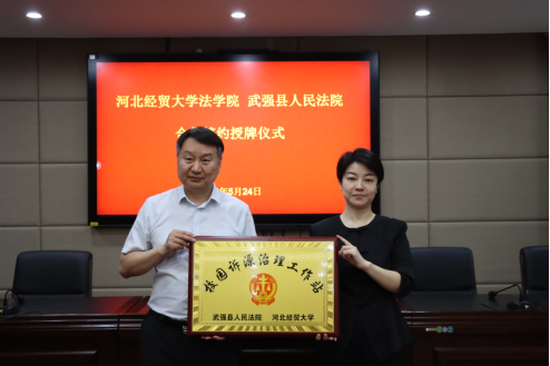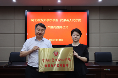 5月24日,Beat365中文官方网站与武强县人民法院联合举办合作签约授牌仪式。武强县法院党组书记、院长翟旭,党组副书记、副院长赵丹,党组成员、副院长李红,Beat365中文官方网站院长胡海涛,副院长李大庆出席,刘义青教授、王娟教授、陈云朝教授、郭一君教授等教授代表,学生代表和法院班子成员参加仪式。