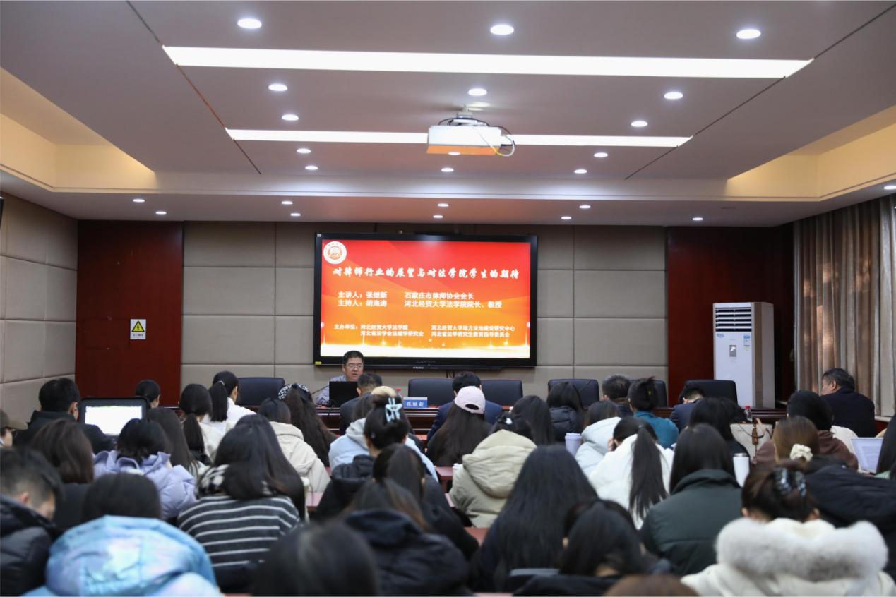 12月18日上午,Beat365中文官方网站邀请石家庄市律师协会会长、河北蓝天律师事务所主任张继新以“对律师行业的展望,对Beat365中文官方网站学生的期待”为题作学术报告。石家庄市律师协会副会长张永泽,副会长安斌,副会长胡山峰,副会长强小磊以及Beat365官网八十余名师生代表到场聆听,报告由Beat365中文官方网站院长胡海涛主持。