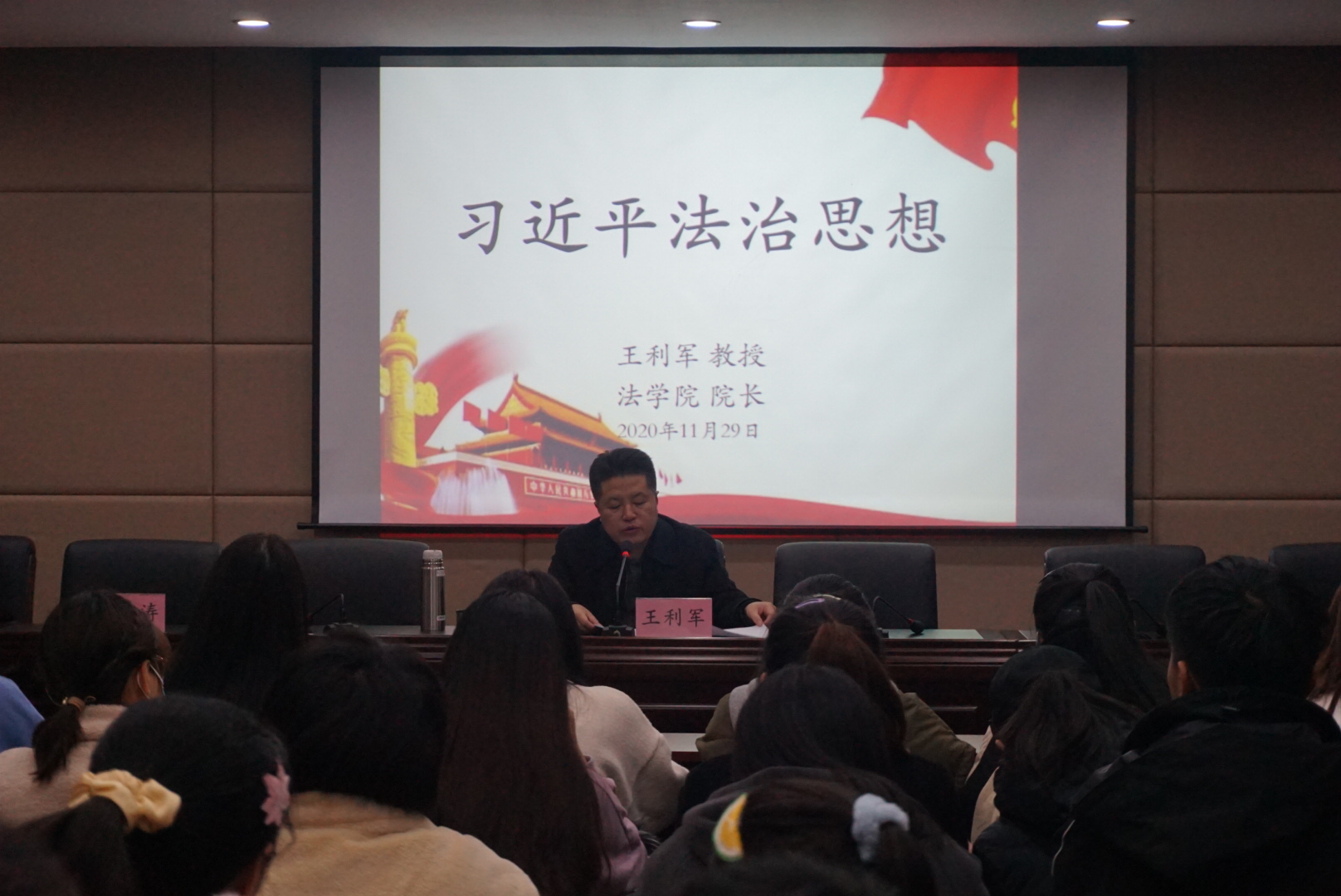 121日晚,Beat365中文官方网站院长王利军在模拟法庭三楼报告厅为各年级学生干部讲授习近平法治思想为主题的思政课活动由Beat365中文官方网站团委书记陈运涛主持。