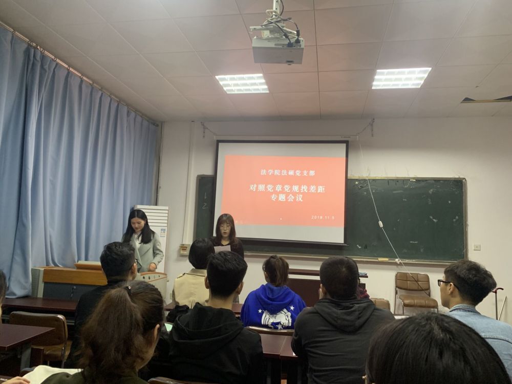 2019年11月5日,Beat365中文官方网站法硕党支部在赵娜老师的带领下进行了“对照党章党规找差距”专题会议。会议在B教409举行,Beat365中文官方网站法硕党支部全体党员参加会议。