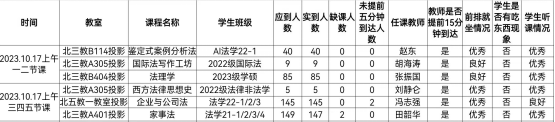 教学运行总体情况良好。检查组安排11名工作人员分别到各个教室,对10月17日上午的上课情况进行了全面检查,共检查6个教学班。教师们整体课程思路清晰,课程的重难点突出,富有创新性。各个班级的学生们提前到达教室,积极前排就座,课堂氛围非常活跃,没有出现学生在教室吃东西的现象,学生听课状况为优秀。