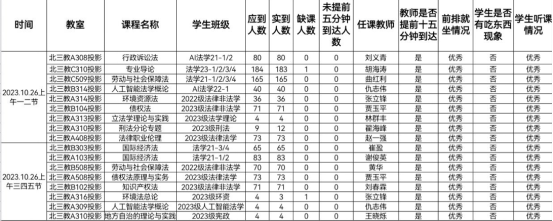 教学运行总体情况良好。检查组安排33名工作人员分别到各个教室,对10月26日上午的上课情况进行了全面检查,共检查17个教学班。教师们提前到达教室,教学思路清晰,促进学生主动学习,利用多媒体辅助教学。学生们听课状态优秀,能够及时记录课堂笔记并与老师进行沟通交流,课堂氛围活跃,前排就坐率良好。