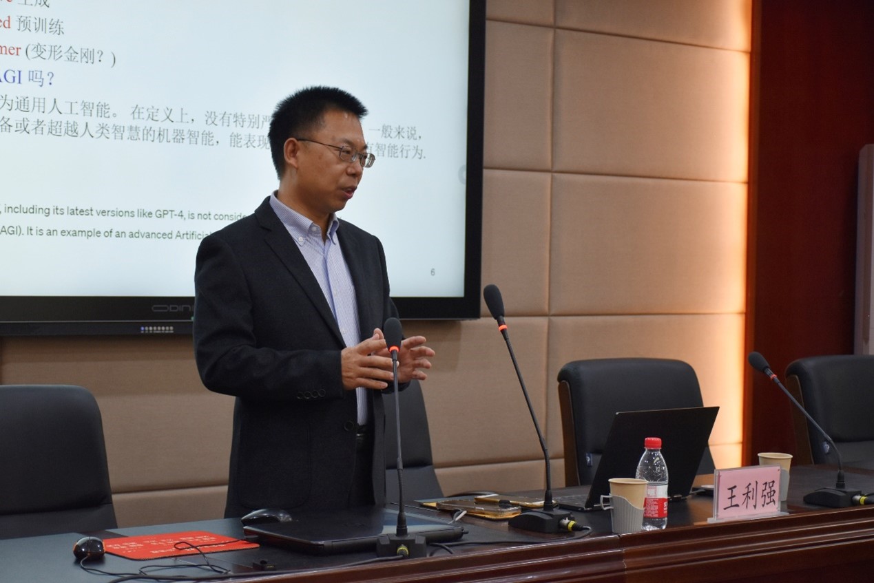 胡海涛作总结发言,他认为王利强教授的报告非常有利于学生未来的实践活动,一种新技术的出现往往会给社会经济的发展起到重大的推动作用,大语言模型ChatGPT的应用,能够极大的提高我们的工作和学习效率。