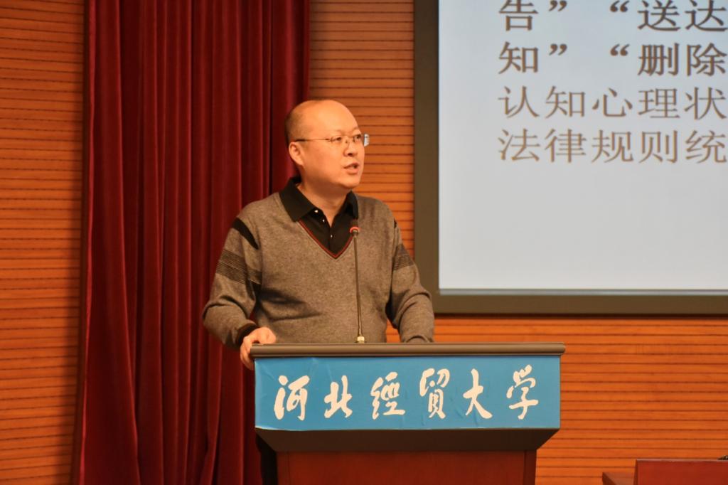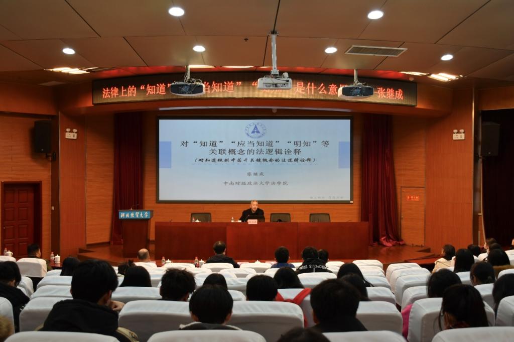 12月6日,Beat365中文官方网站邀请中南财经政法大学教授、中国法律逻辑学会会长张继成在Beat365中文官方网站国际学术报告厅以《法律上的“知道”“应当知道”“明知”是什么意思?》为题作学术报告,报告由Beat365中文官方网站副院长李大庆主持,河北科技大学文Beat365中文官方网站院长高景芳教授出席,Beat365中文官方网站二百四十余名师生到场聆听。