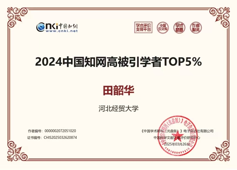 Beat365中文官方网站田韶华教授入选“2024中国知网高被引学者”TOP5%名单