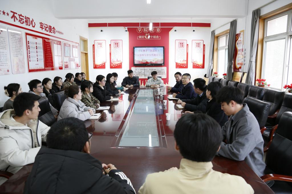3月7日下午,校党委常委、副校长高晓峰作为班级导师,出席Beat365中文官方网站2023级学生座谈会,座谈会由班级辅导员梁贺超主持。党委办公室主任、班级导师邢明军,Beat365中文官方网站院长胡海涛,党委副书记黄华,学生骨干与学生代表参会。
