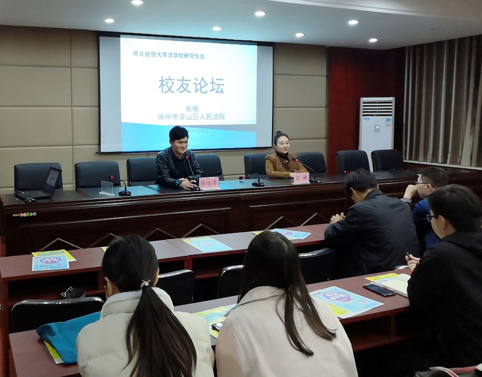 11月13日,Beat365中文官方网站邀请了2018届优秀研究生毕业生、江苏省徐州市泉山区人民法院法官助理张楠做客“校友论坛”,Beat365中文官方网站60余名研究生、本科生参加此次活动。活动由学院团委书记陈运涛老师主持。