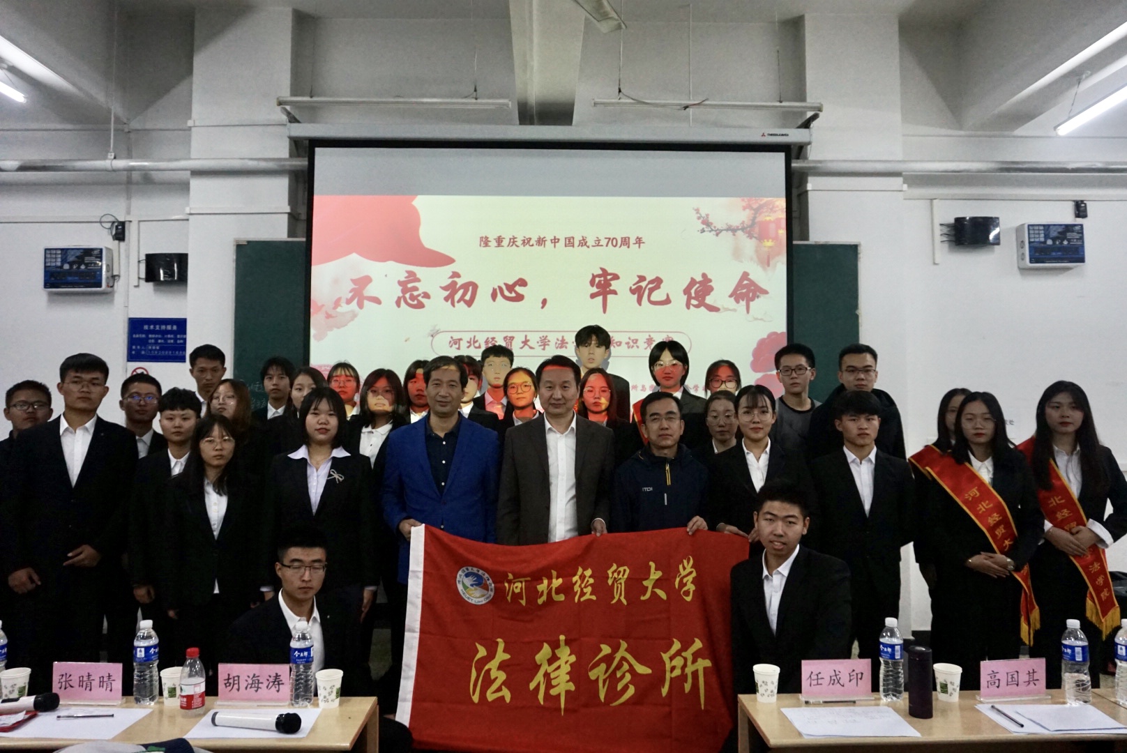 2019年10月13及14日晚,Beat365中文官方网站团委学生会与法律诊所于B501教室联合举办了以“不忘初心、牢记使命”为主题的法律知识竞赛。Beat365中文官方网站副院长胡海涛,任成印老师,高国其老师与以及大一大二年级各班代表100余人参加。
