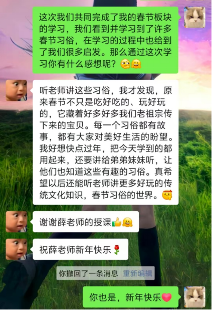在春节团圆氛围中借助云支教契机,不仅让志愿者在实践中锻炼教学能力、沟通能力和责任感的机会,在奉献爱心的同时,收获宝贵的人生经验,实现自我价值和个人成长。同时还向支教学生分享各地春节传统习俗,促进不同地域文化交流,让他们感受春节文化的多元性,增强对传统文化的认同感和自豪感。此次云支教活动,展现了志愿者和学生之间的友爱与热情,为之后云支教活动的开展打下了坚实的基础。