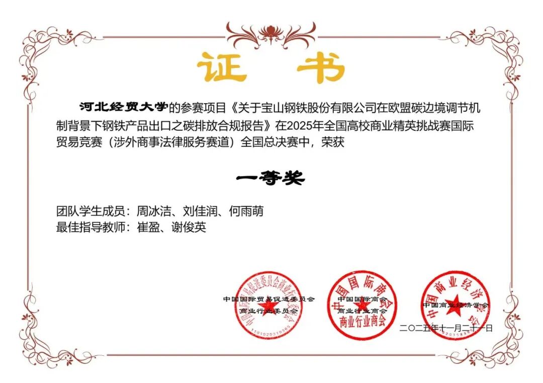 为深入贯彻党中央、国务院关于落实“强化外贸发展人才支撑”的核心要求,2025年11月,第十九届全国高校商业精英挑战赛国际贸易竞赛全国总决赛圆满落幕。本次竞赛由中国国际贸易促进委员会商业行业委员会、中国国际商会商业行业商会和中国商业经济学会联合主办,是纳入全国普通高校大学生竞赛排行榜的国家级A类赛事。决赛汇聚了武汉大学、上海对外经贸大学、中央财经大学等全国30个省(自治区、直辖市)近600所高校的顶尖代表队。Beat365官网两支参赛队伍不负众望,在涉外商事法律服务赛道分别斩获国家级一等奖、国家级三等奖,彰显了Beat365官网人才培养的扎实成效!