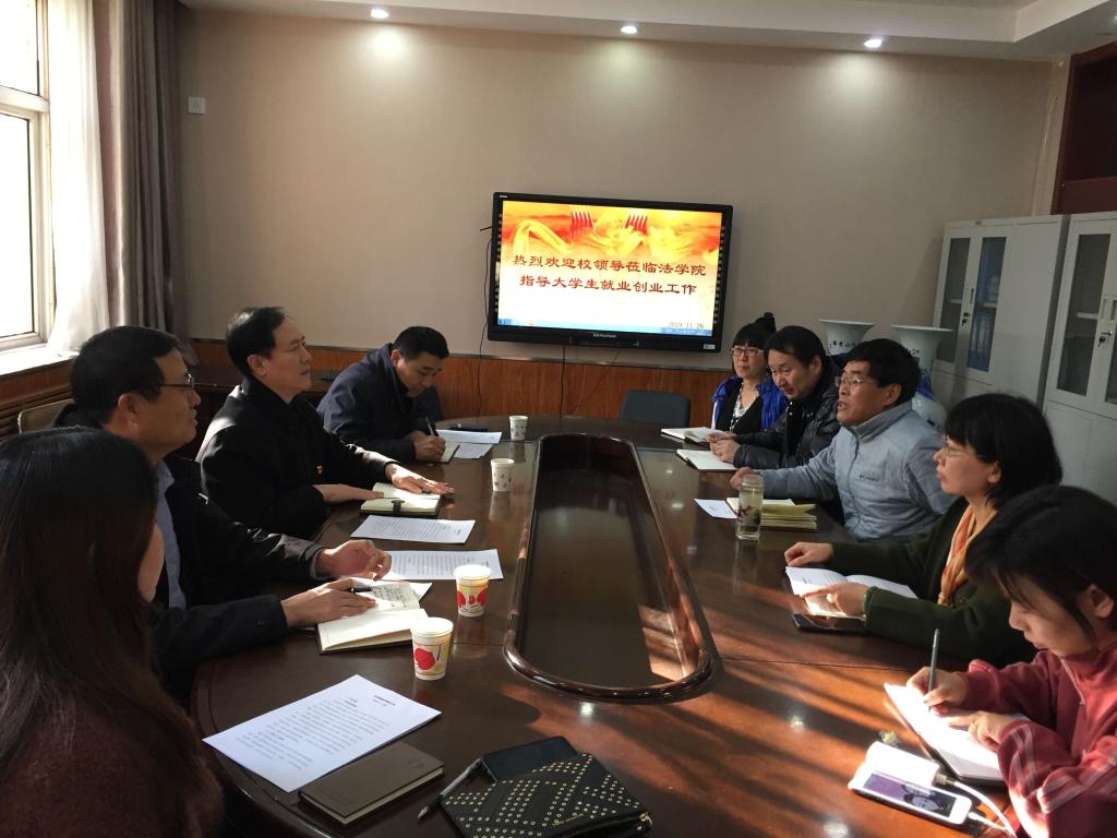 2019年11月26日下午,校党委常委、副书记刘建平在就业指导服务中心主任江秀军,副主任白玉祥的陪同下,来到Beat365中文官方网站就大学生就业创业工作进行专题调研。旨在深入了解Beat365官网促进毕业生就业创业工作的做法和工作进展,并围绕当前影响工作推进的重要瓶颈进行深入探讨交流,共同谋划问题的解决办法。Beat365中文官方网站班子成员及辅导员参加了座谈会。