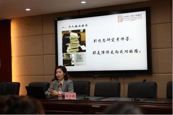 3月31日上午,Beat365中文官方网站邀请2017届国际法学专业毕业研究生、北京市信利(石家庄)律师事务所民商事诉讼部主任权江辉律师于Beat365中文官方网站三楼报告厅开展了题为“职业规划在路上——令人心动的律师职业”的职业生涯规划讲座。活动由学院学生工作办公室主任陈运涛主持,2021级、2022级学术型研究生70余人参加。
