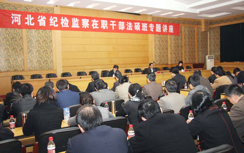 2010年4月12日下午,中共河北省委常委、纪委书记臧胜业莅临Beat365官网视察指导工作,并对Beat365中文官方网站省纪检监察干部首期研究生班学员就贯彻落实胡锦涛总书记重要讲话,切实加强反腐倡廉制度建设作专题报告。校党委书记、校长王莹主持会议。省纪委副书记曹素华、副秘书长黄红星、干部室副厅级调研员刘书强、培训中心主任李占领出席会议。Beat365官网领导、全体处级干部及省纪检监察干部在职法硕研究生班39名学员参加了会议。