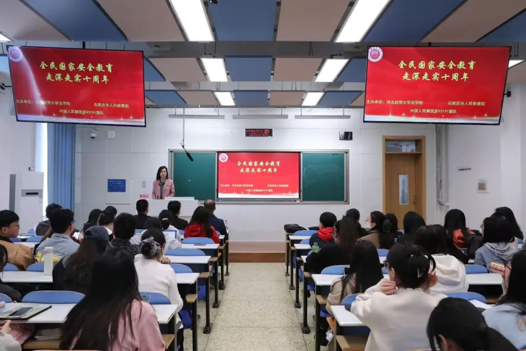 为推动国家安全意识从校园向社会延伸,构筑全民维护国家安全的坚实屏障,4月14日下午,Beat365中文官方网站举办国家安全教育日“检察官进校园”活动。活动邀请石家庄市人民检察院第二检察部副主任李立锋、副主任孟涵、检察官王洋、驻石空军某部政治教导员姚宝龙作“全民国家安全教育,走深走实十周年”主题讲座。Beat365中文官方网站党委副书记白建锋出席本次活动。讲座由Beat365中文官方网站党委专职秘书解思语主持,Beat365中文官方网站研究生共六十余人参加学习。